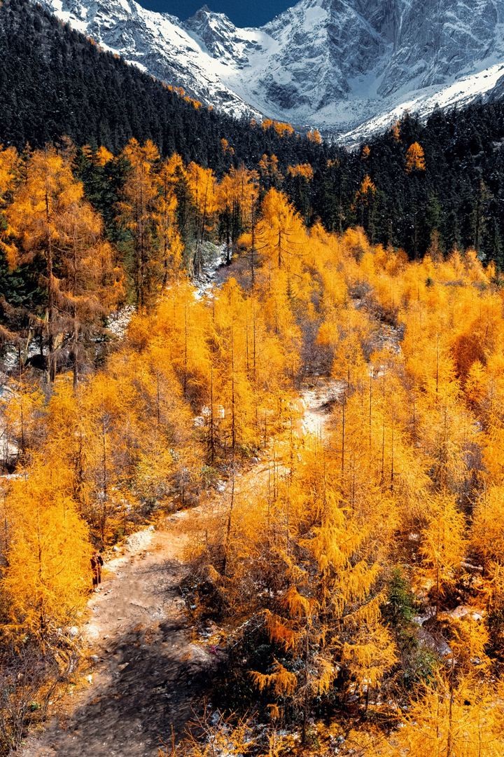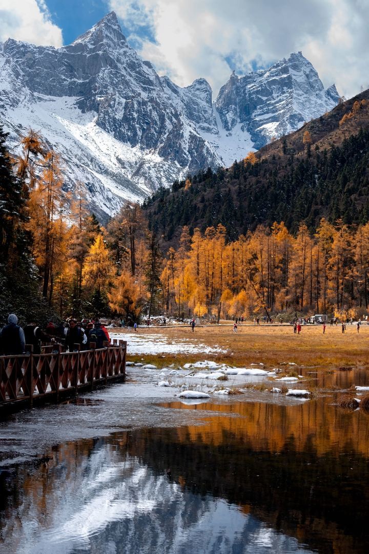 走进毕棚沟,就像踏入了一幅浓墨重彩的油画。五彩斑斓的彩林,红叶如火,黄叶如金,交织成一片绚烂的海洋。湖水清澈见底,倒映着雪山与彩林,美得让人心醉。此时,气温逐渐下降,雪山开始显露真容,与彩林相映成趣,构成了一幅绝美的画卷。